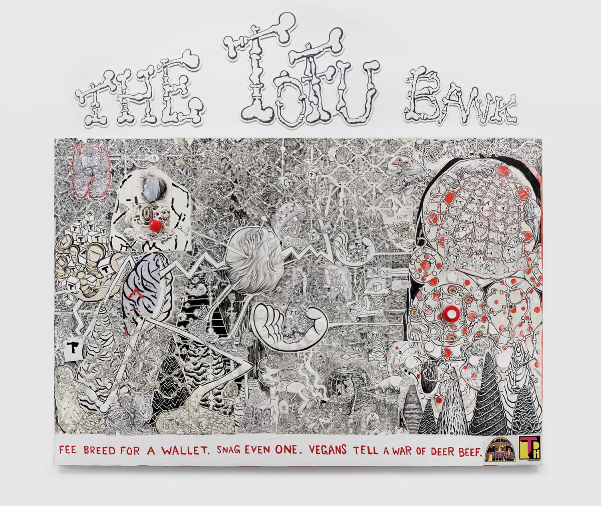 Trenton Doyle Hancock’s “The Skint Alterpiece: Vegans Make Deposits at the Tofu Bank,” 2020.