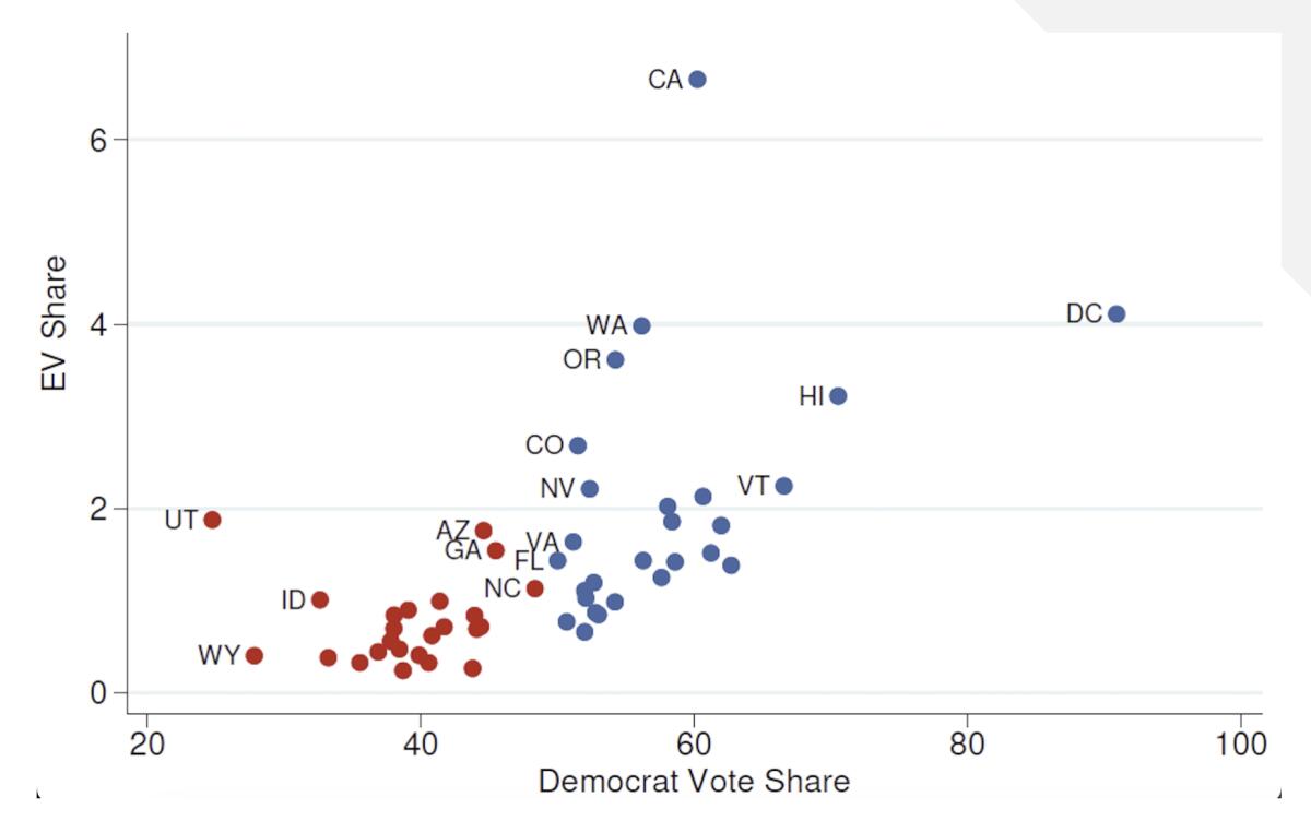 EV sales as a share of all vehicles in 2012-2022 showed a marked relationship with statewide partisan voting, with blue states leading red states in EV sales.
