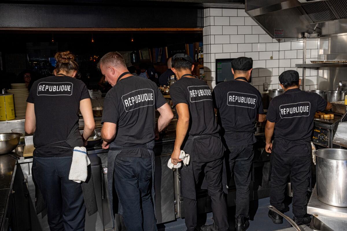Chef Walter Manzke, second from left, and the kitchen team at République in Los Angeles. The restaurant, like many others, is weighing increasing the cost of some egg dishes as the bird flu outbreak continues to affect egg prices.